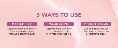 - PODKLADOVÁ BÁZA POD MAKE-UP TVÁRE A OBLASTI POD OČAMI: Naneste na čistú pokožku alebo po úplnom vstrebaní hydratačného krému. Rozotrite pod očami, aby ste vyhladili jemné vrásky, na nos a líca, aby ste minimalizovali vzhľad pórov a škvŕn, do t-zóny pre matný výsledok