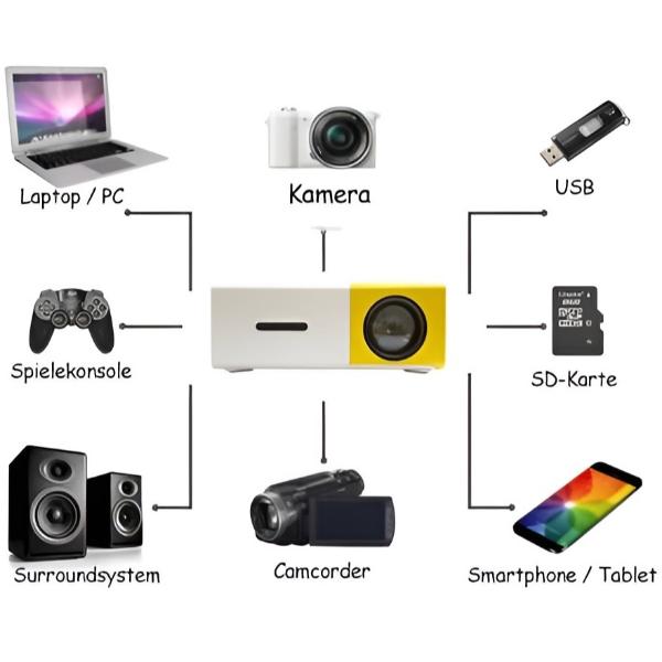 Vďaka viacerým portom, ako sú USB, HDMI a AV, tento projektor zaručuje zábavu bez ohľadu na to, aké zariadenie používate.
