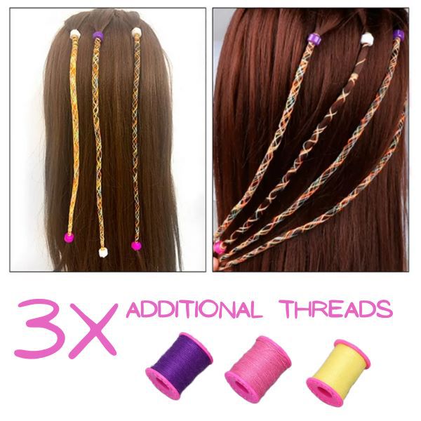 • Balenie obsahuje: 1x strojček na zapletanie vlasov, 12x sponky do vlasov, 3x niť (žltá, ružová a fialová niť), 2x príslušenstvo pre jednoduchšie použitie.