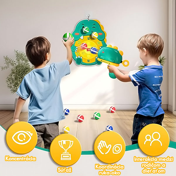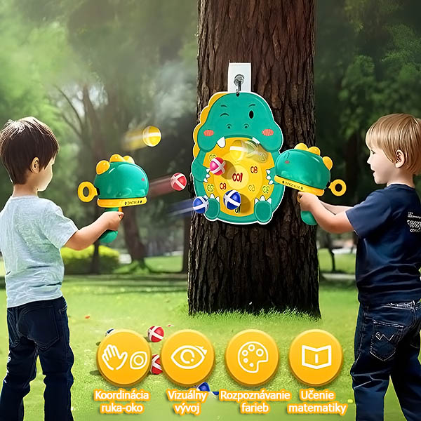 Deti môžu mieriť a strieľať lepiace guľôčky pomocou vystreľovača v tvare dinosaura alebo ich hádzať rukou, čím získajú inú výzvu. Každá aktivita zlepšuje ich motorické zručnosti, zlepšuje priestorové povedomie a buduje sebadôveru pri zbieraní bodov na šípkach.